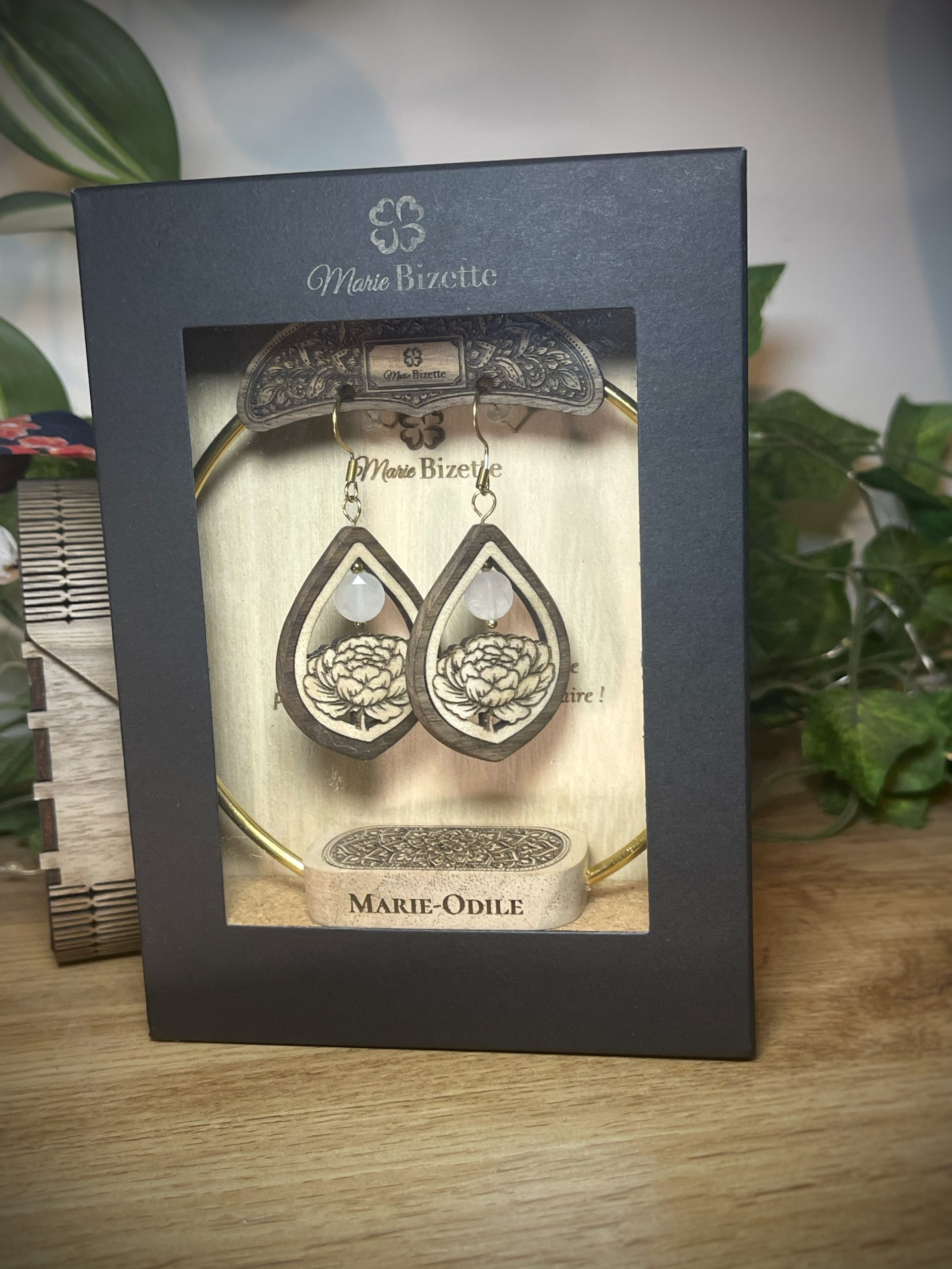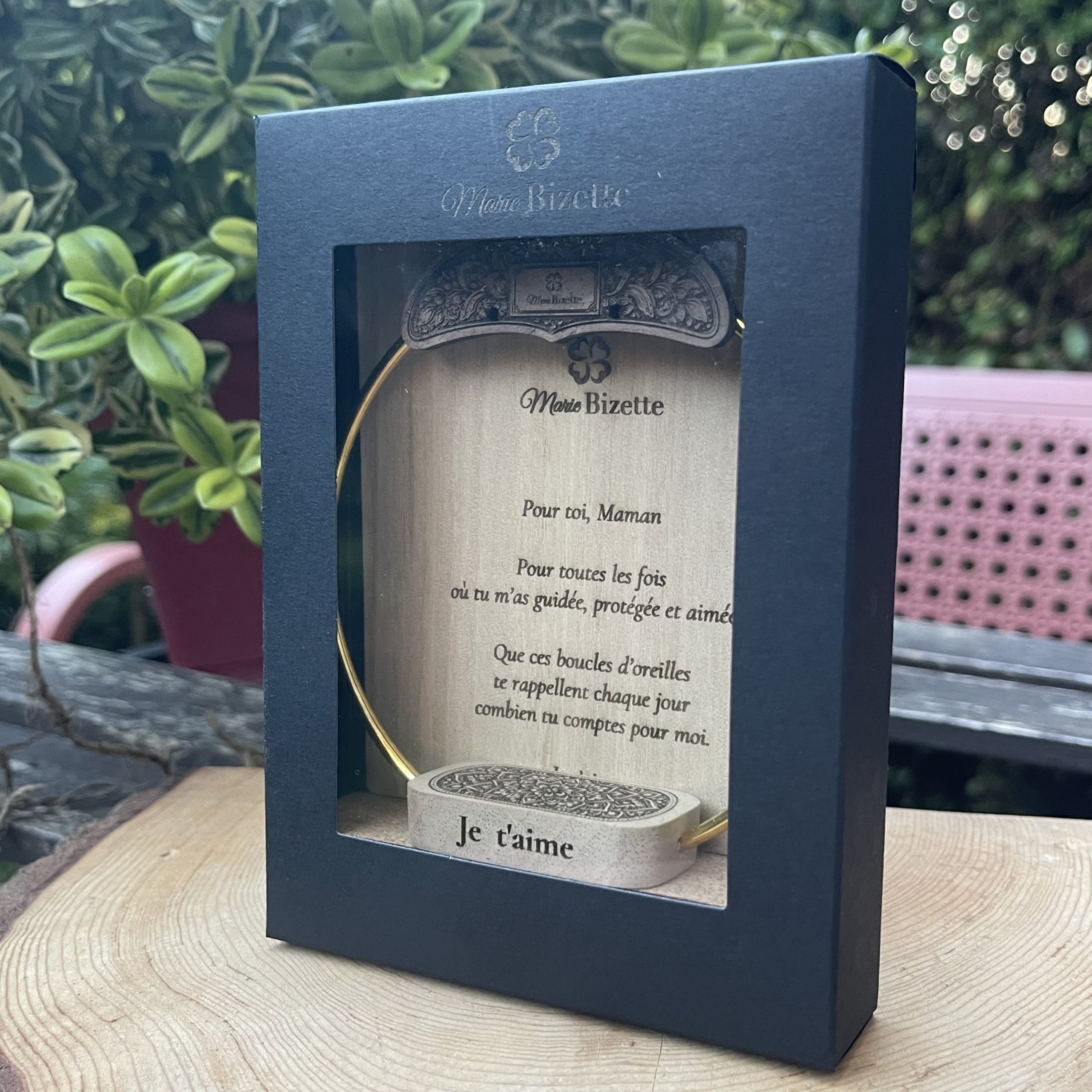 Ce coffret Marie Bizette a été imaginé comme un écrin chargé d’émotion, pour dire je t’aime, merci ou tu comptes pour moi. À l’intérieur, un présentoir élégant met en valeur le bijou de votre choix, accompagné d’un message gravé qui restera gravé dans le bois… et dans le cœur.