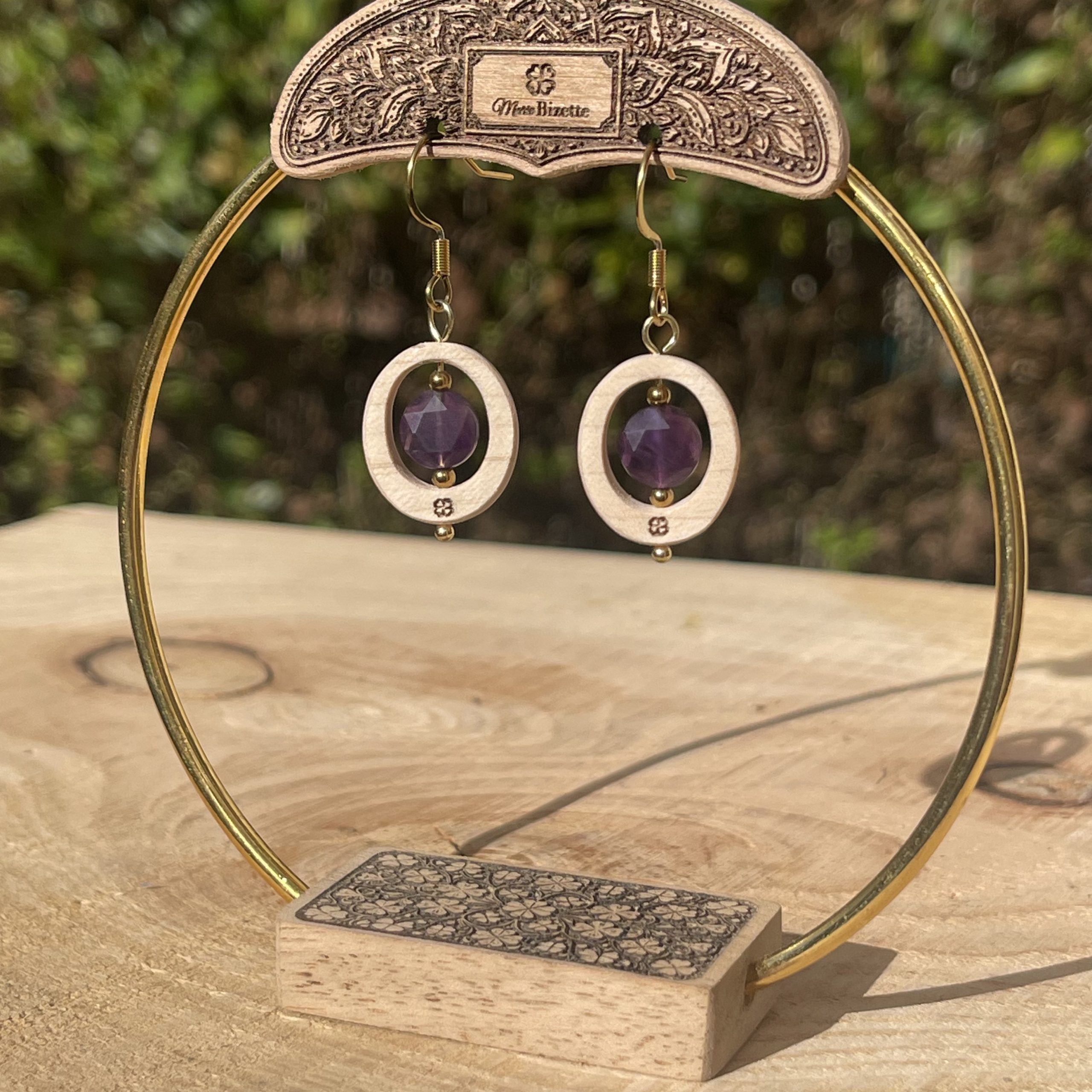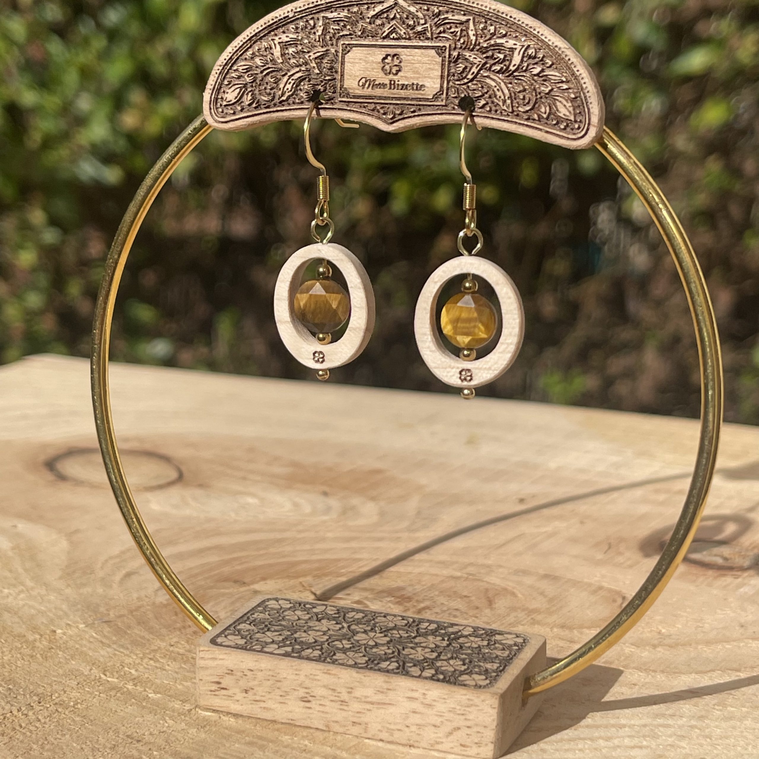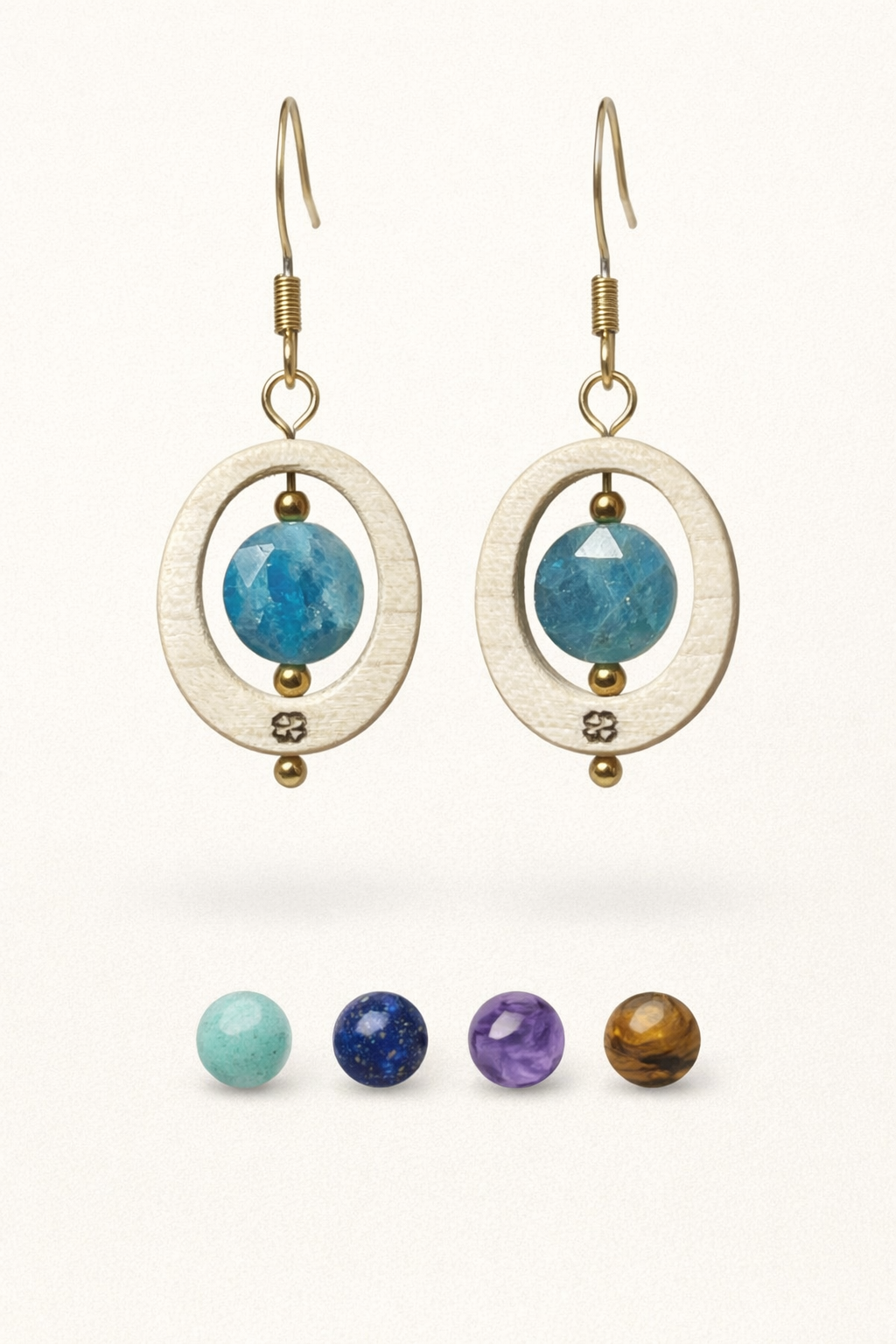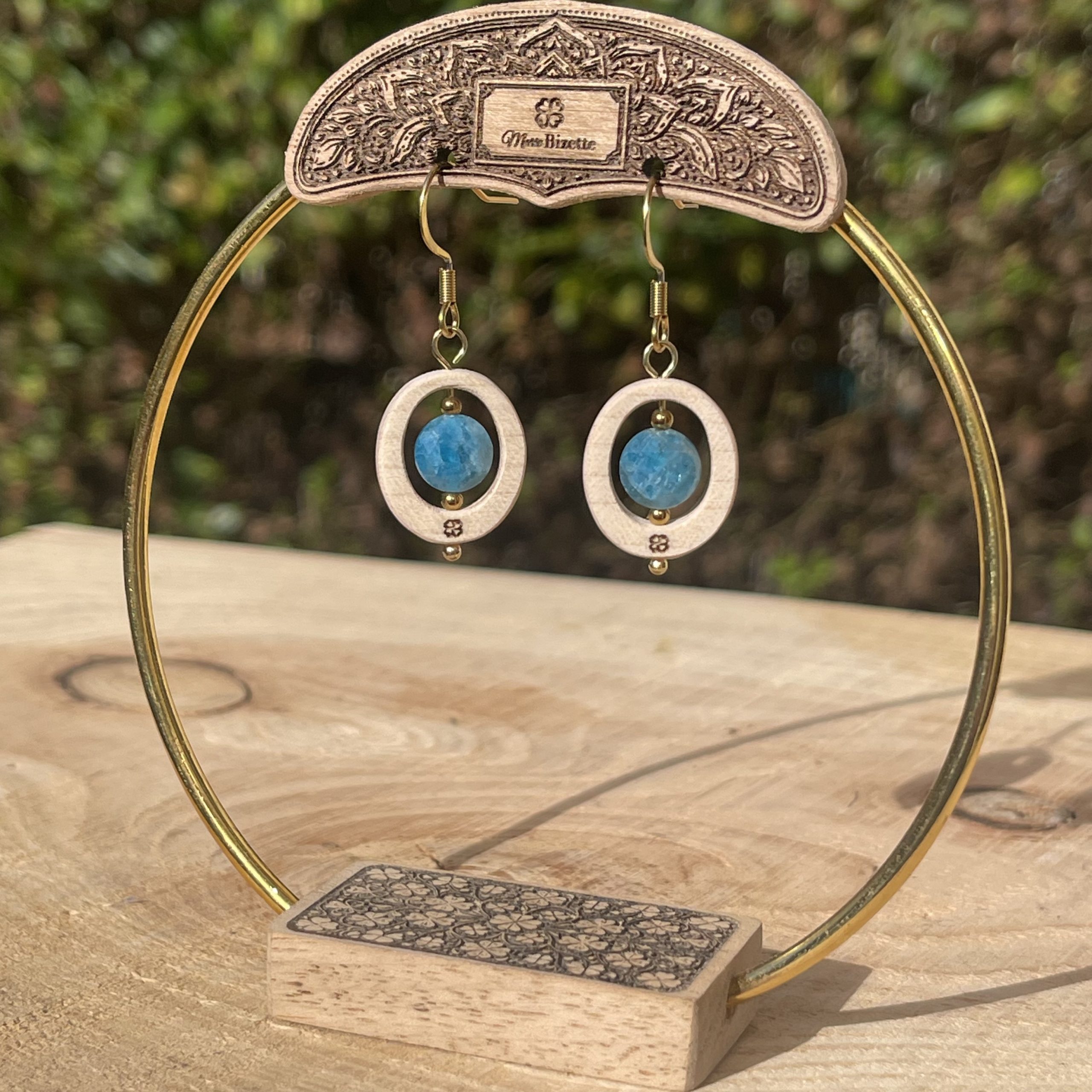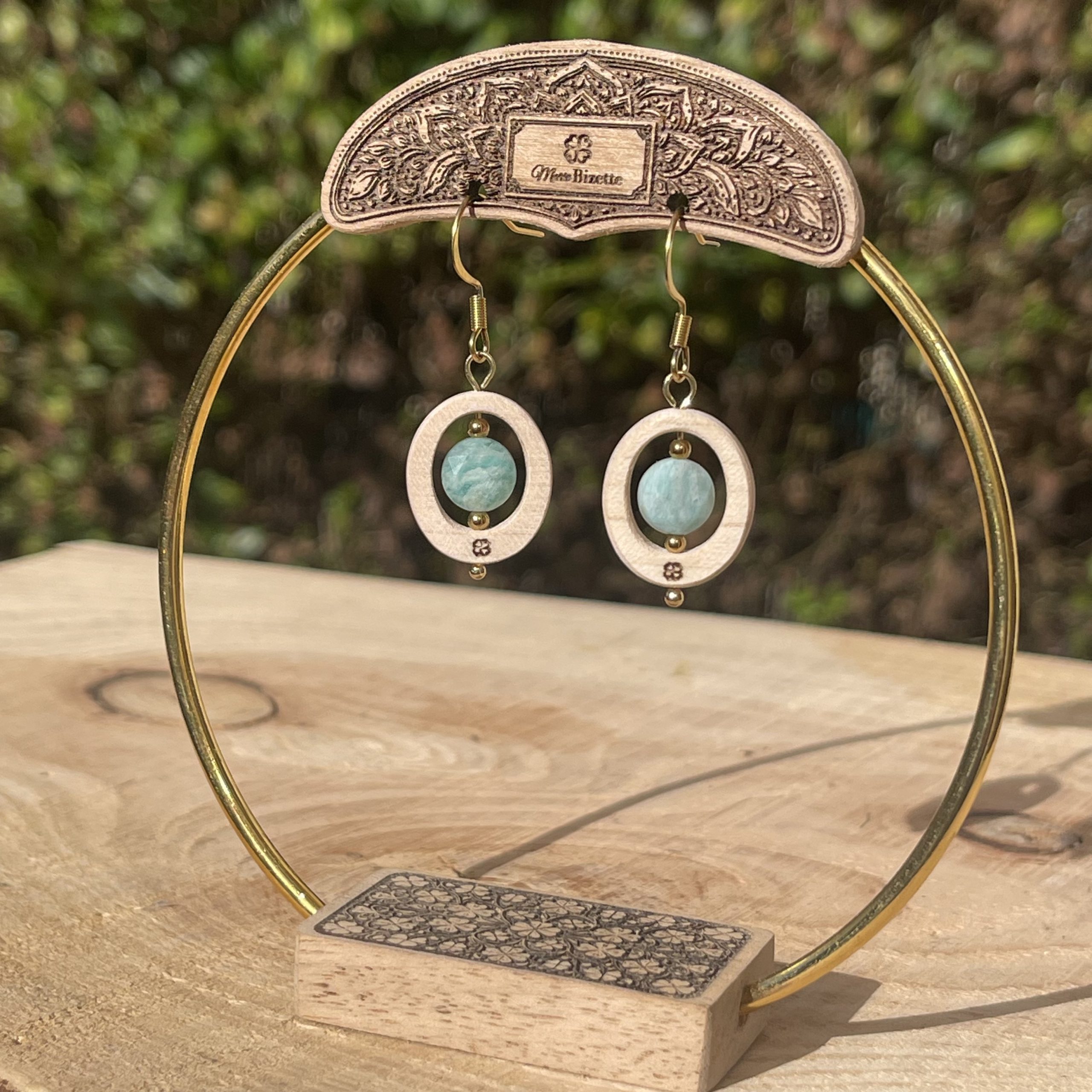 Boucles d’oreilles Intime en érable français avec pierre naturelle centrale. Le bois clair met en valeur la couleur de la pierre et révèle toute sa lumière. Choisissez votre pierre : amazonite du Pérou, apatite, lapis-lazuli, améthyste ou œil du tigre. Finition artisanale : découpe laser, huilage et polissage manuel avec attache acier inoxydable 316L chirurgical.