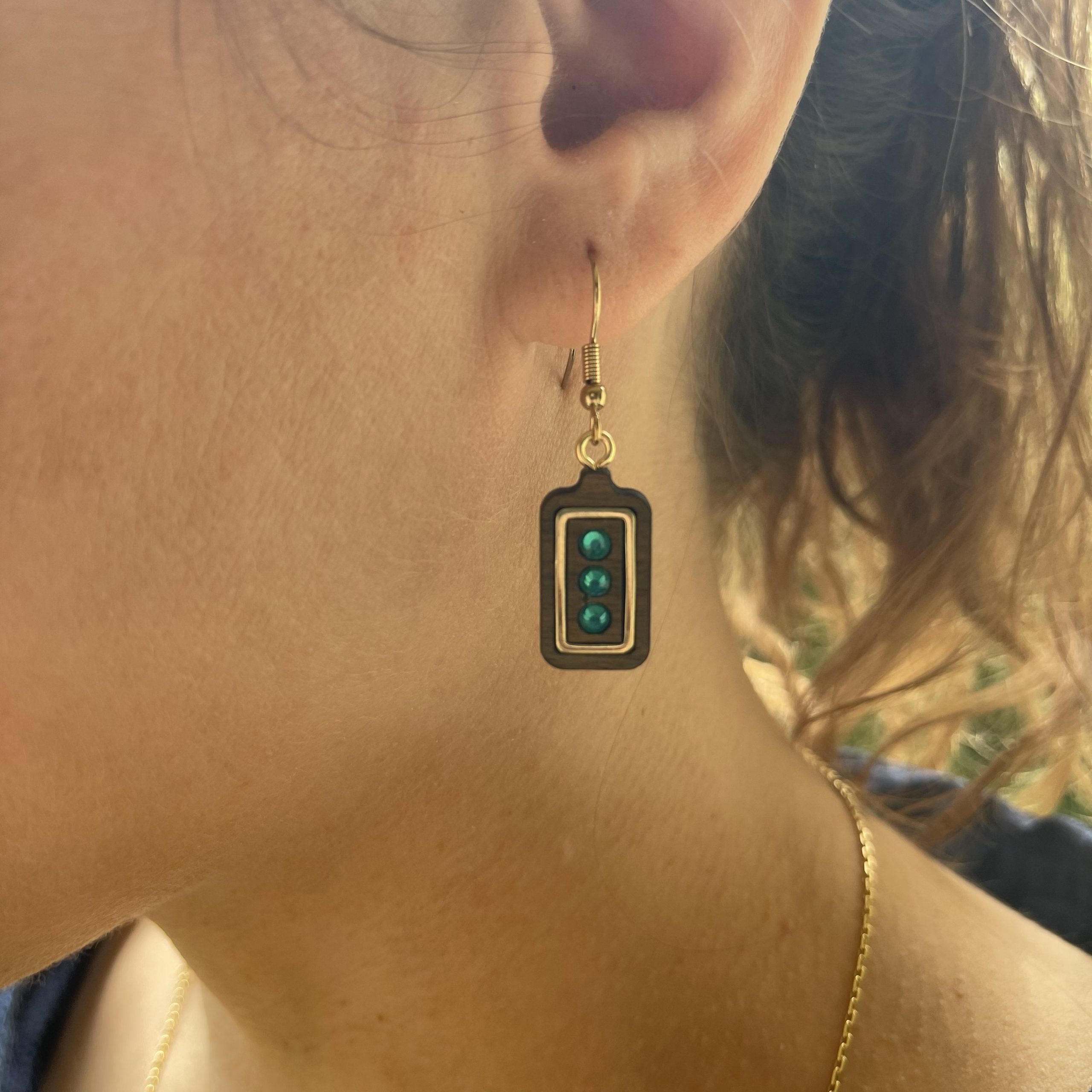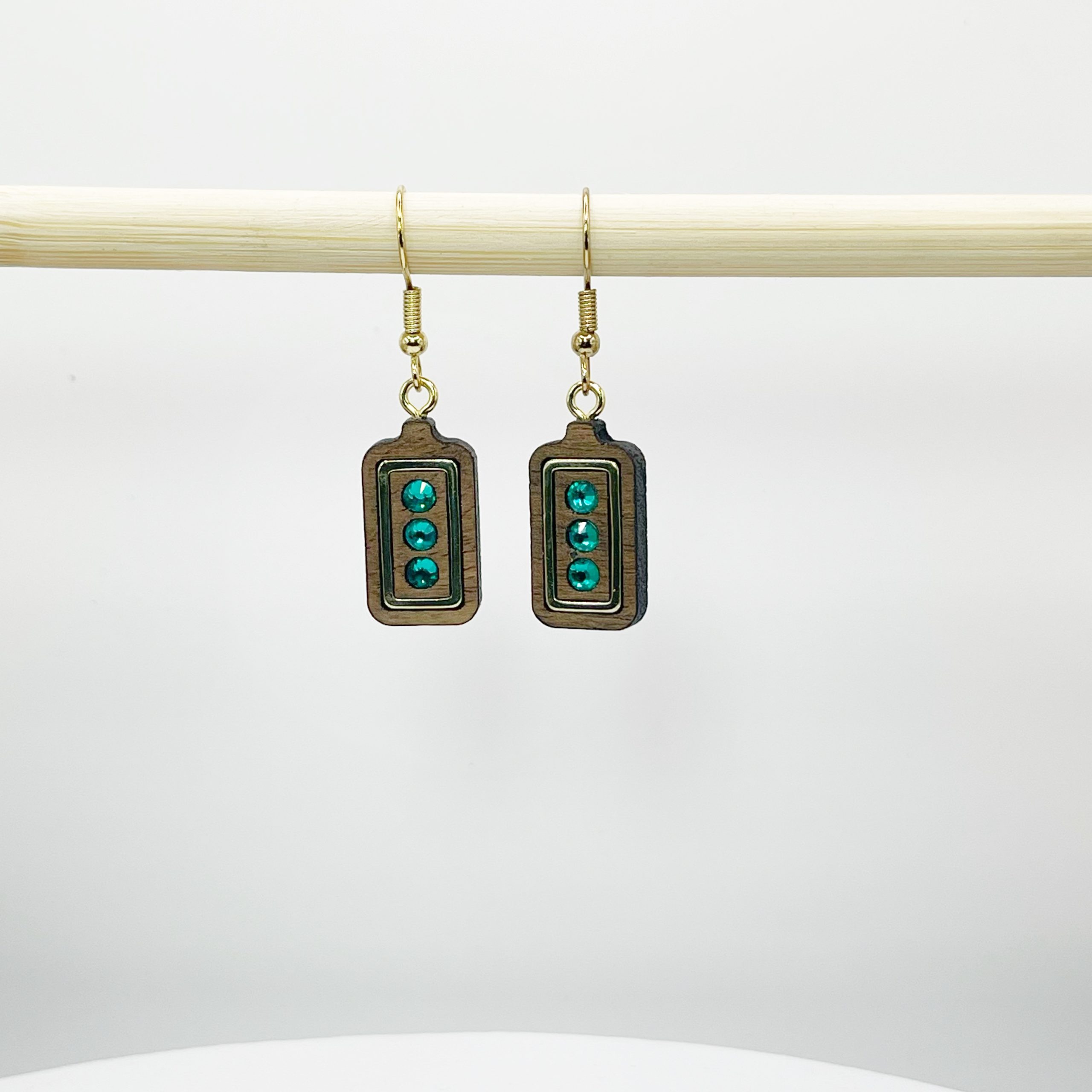 Un rectangle en noyer accueille trois strates de verre émeraude, empilées avec soin au centre d’un encadrement doré.