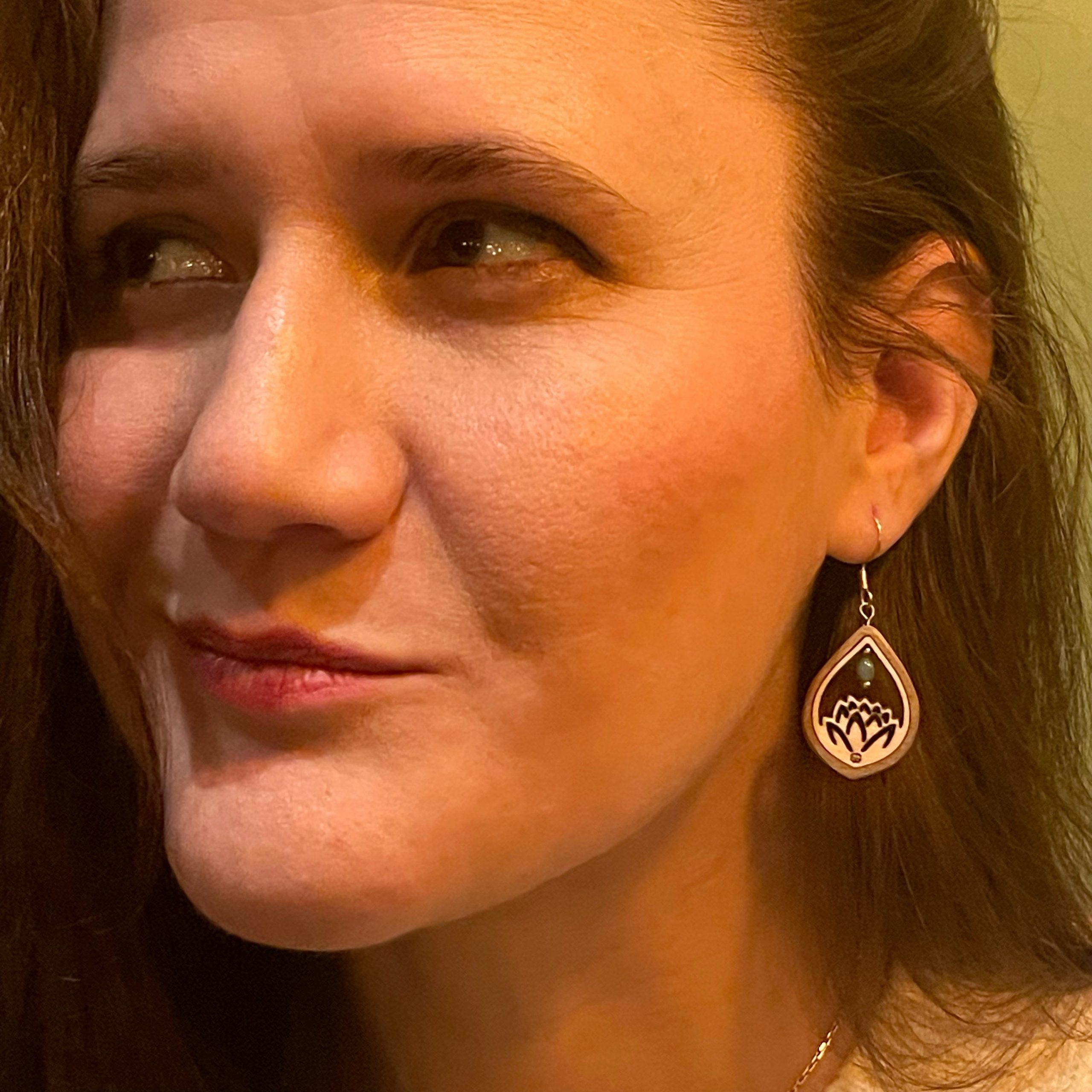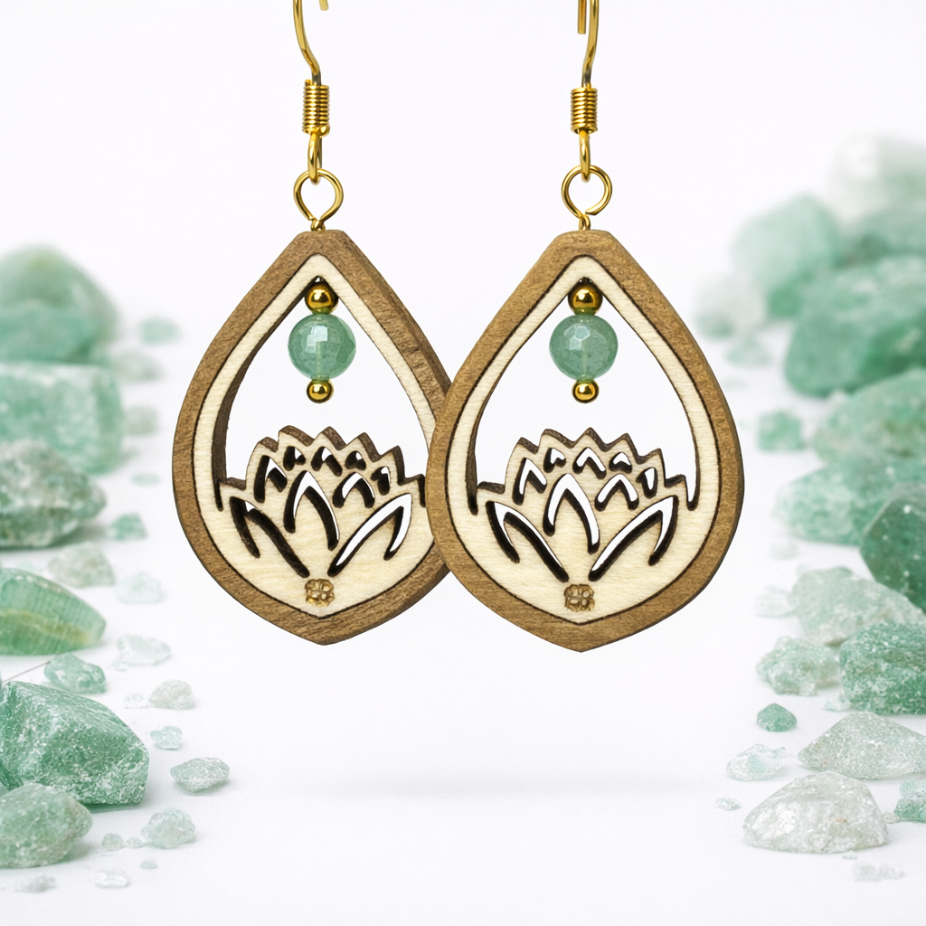 Mini Lotus est une boucle d’oreille inspirée du mouvement de la fleur qui s’ouvre lentement. La découpe dentelle, finement travaillée, dessine un lotus ajouré, symbole d’équilibre et de renouveau. Le double bois — érable clair et noyer — crée un jeu de contrastes subtils, tandis que la pierre centrale semble suspendue, comme en équilibre. Un bijou léger et délicat, pensé pour accompagner le corps avec douceur et élégance.