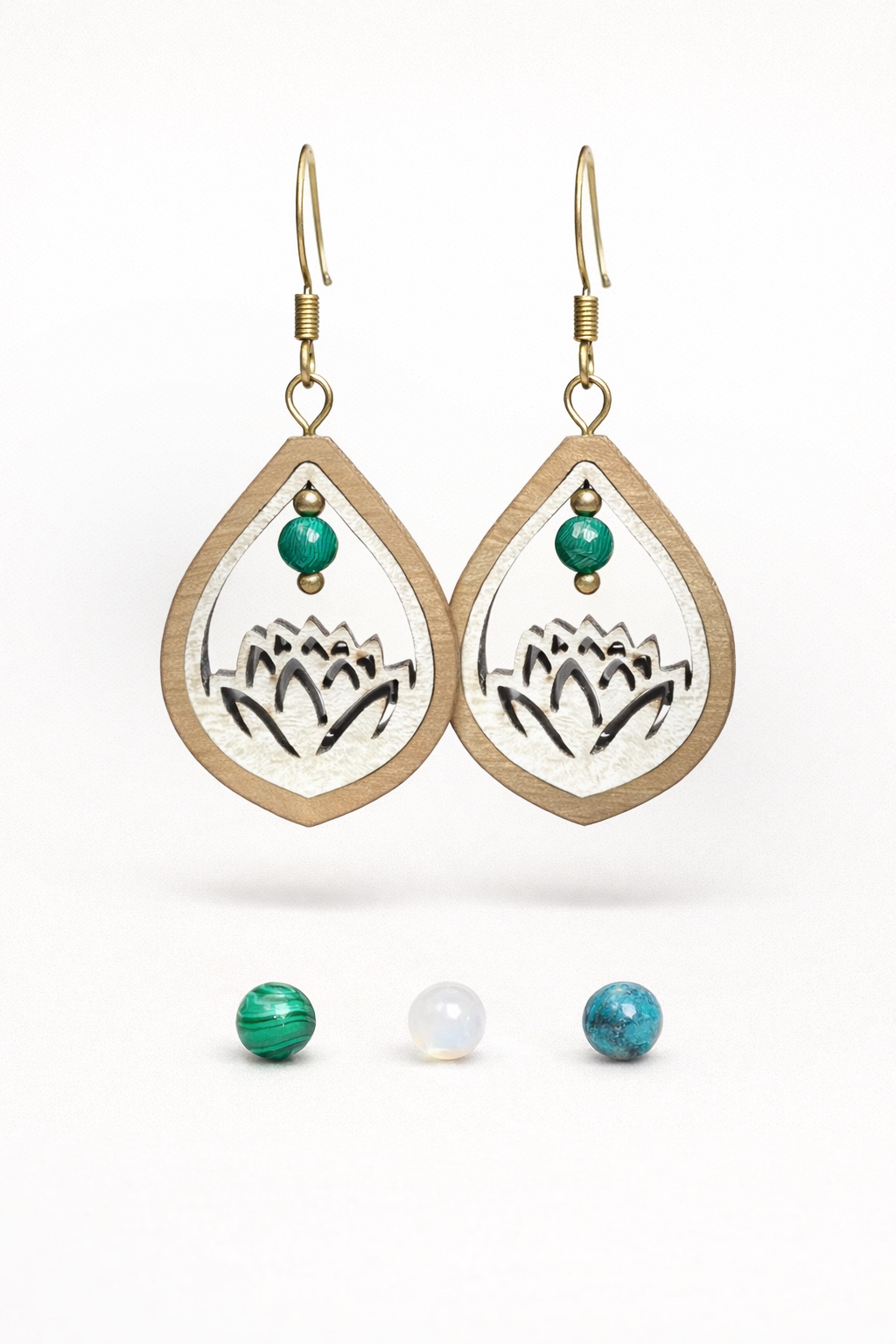 Boucles d’oreilles Mini Lotus en érable et noyer, ornées d’une pierre naturelle au choix (pierre de lune, apatite ou malachite).